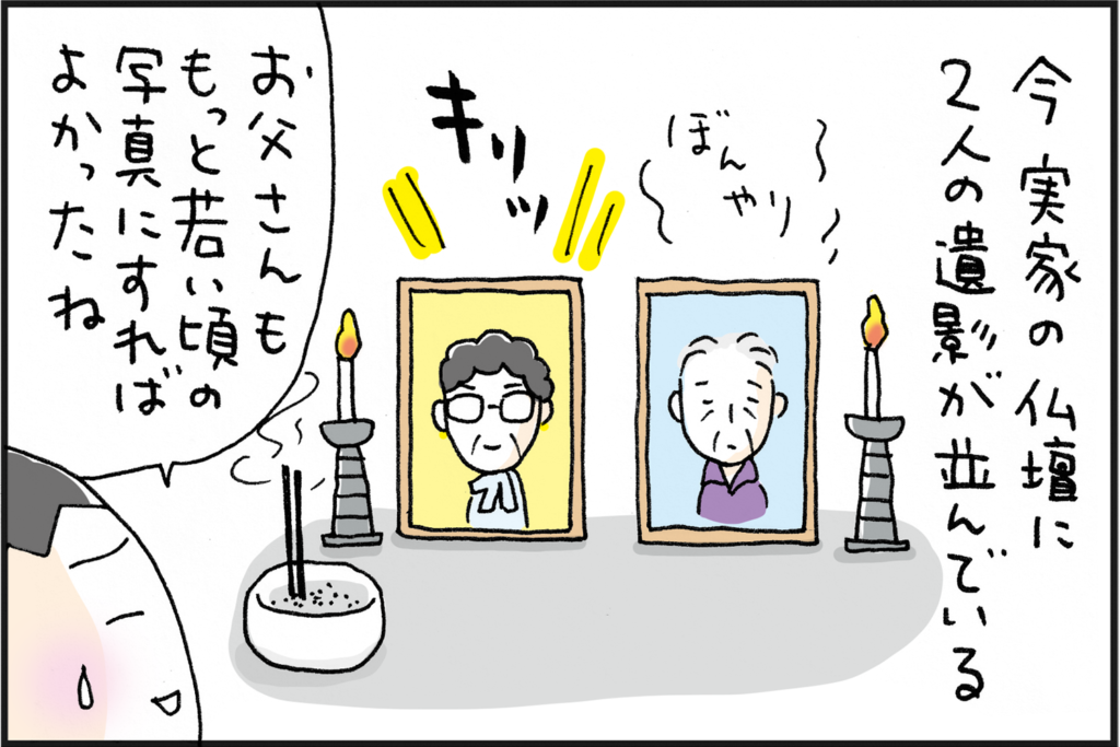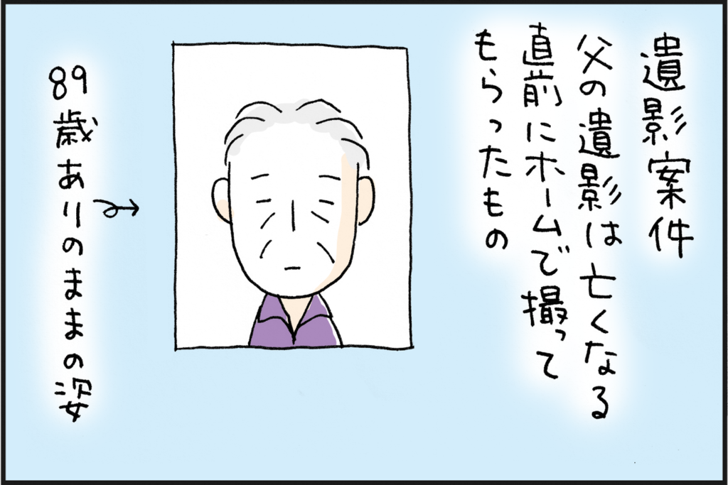 父の時は急いでいたので、そんなことを考える余裕もなく、ホームでイベントの時に撮ってもらった写真を使用。ヨレヨレのおじいちゃん!という感じ。