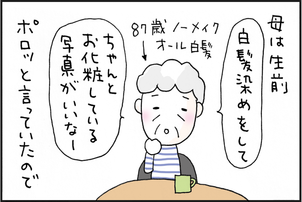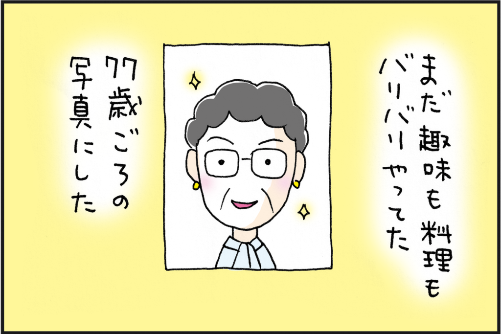 母は以前から希望を聞いていたので、70代後半の写真にしました。髪も染めて黒く、化粧もバッチリ。まゆもキリッとしている。あの頃はいくつかの趣味に精力的に向き合ってた。